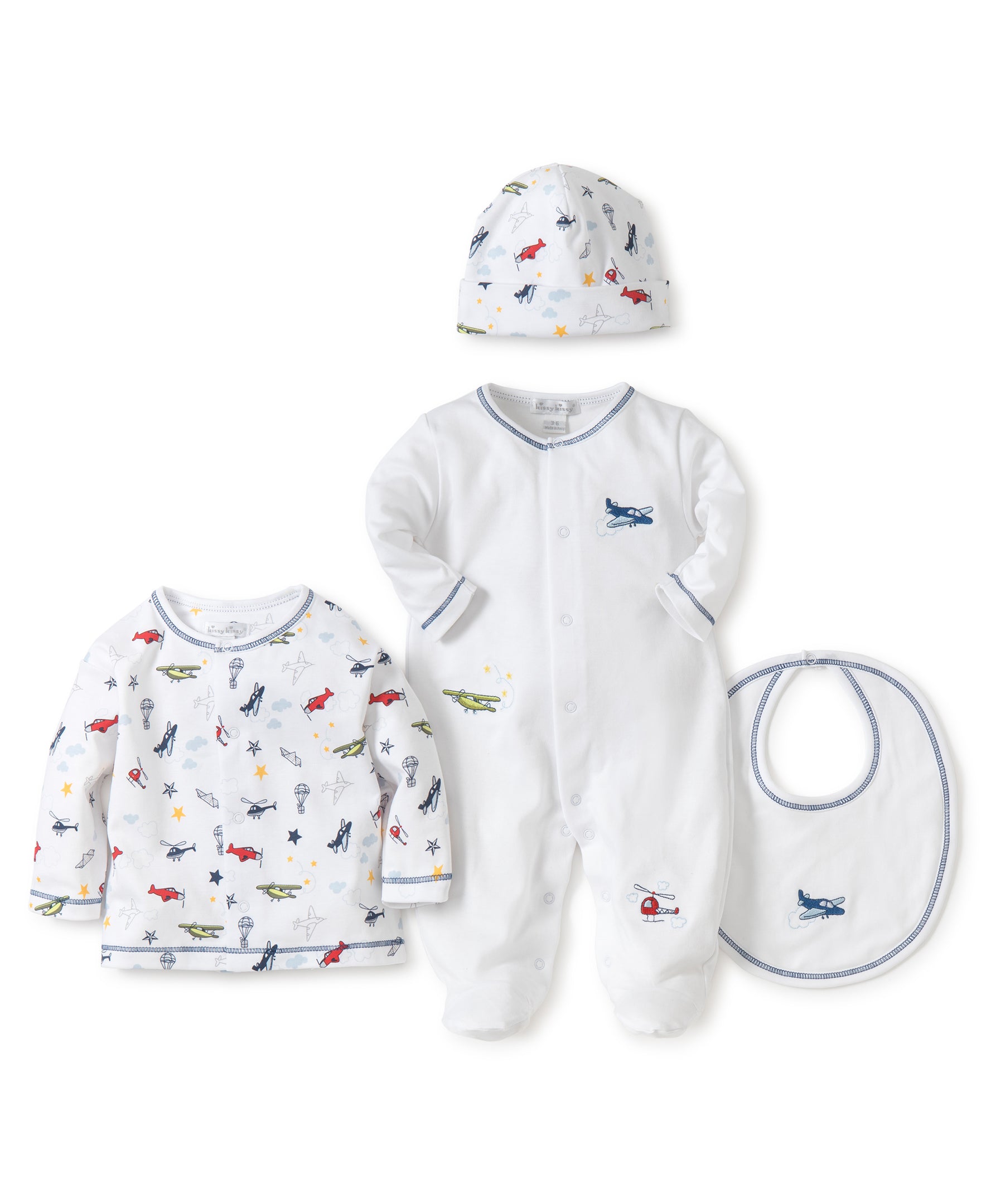 Take baby home in this aviator themed footie and jacket set that comes complete with a matching hat and bib in a giftable dainty tulle bag. Made from 100% Pima cotton for a soft and comfortable fit.